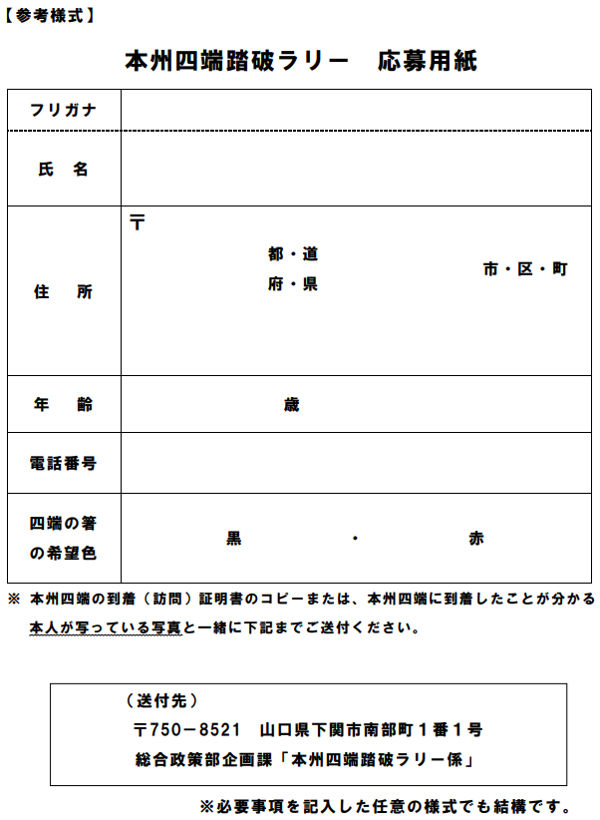 〒750-8521 山口県下関市南部町1番1号 下関市総合政策部企画課「本州四端踏破ラリー係」