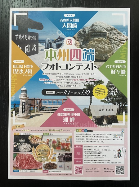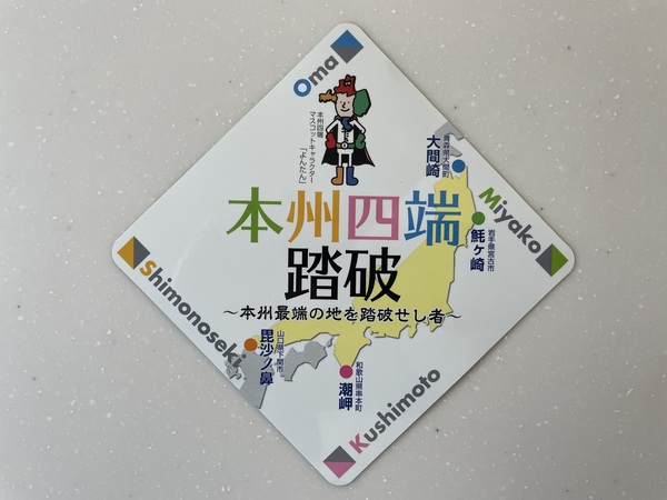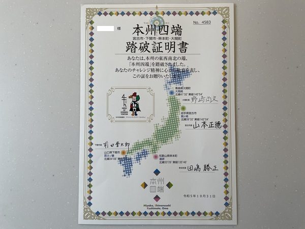 - 本州四端のまち(岩手県宮古市、山口県下関市、和歌山県串本町、青森県大間町)をすべて訪れた踏破者が貰える、本州四端各市町の首長直筆サイン入りのゴージャスな証明書!