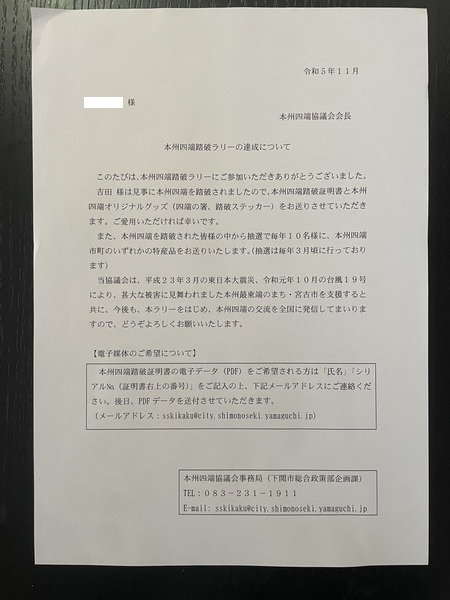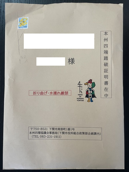 - 加えて、証明書と一緒に本州四端オリジナル記念品も貰えます!